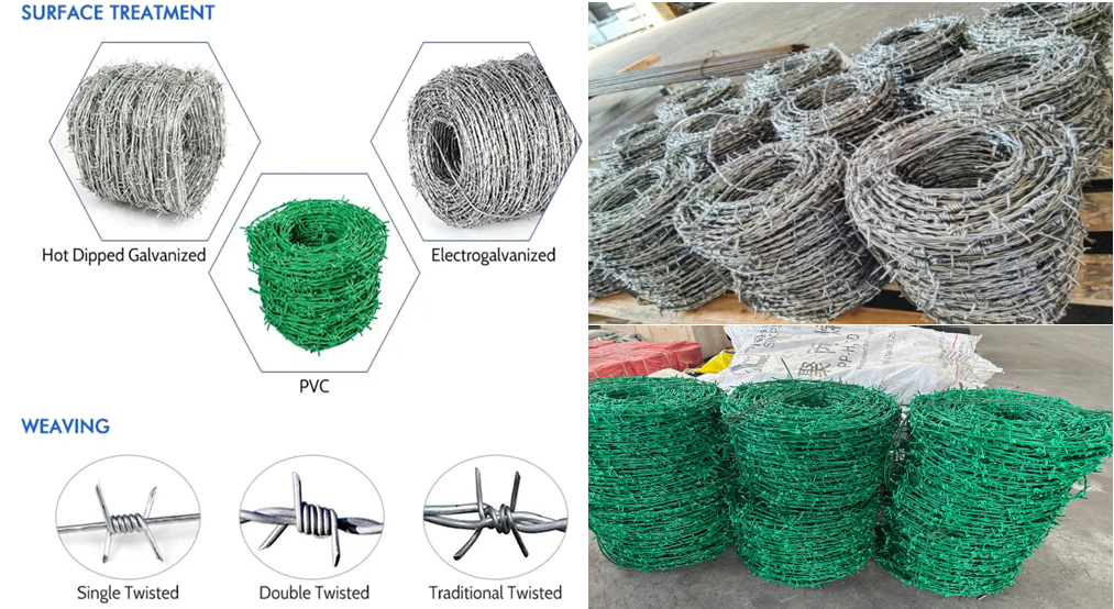 The materials to make barbed wire : Generally used is the hot -diped eletro-galvanized and PVC coated wire AISI430 and AISI304, PVC-Plated, Low Carbon Steel Wire, Thermo-Plated with Zinc etc.